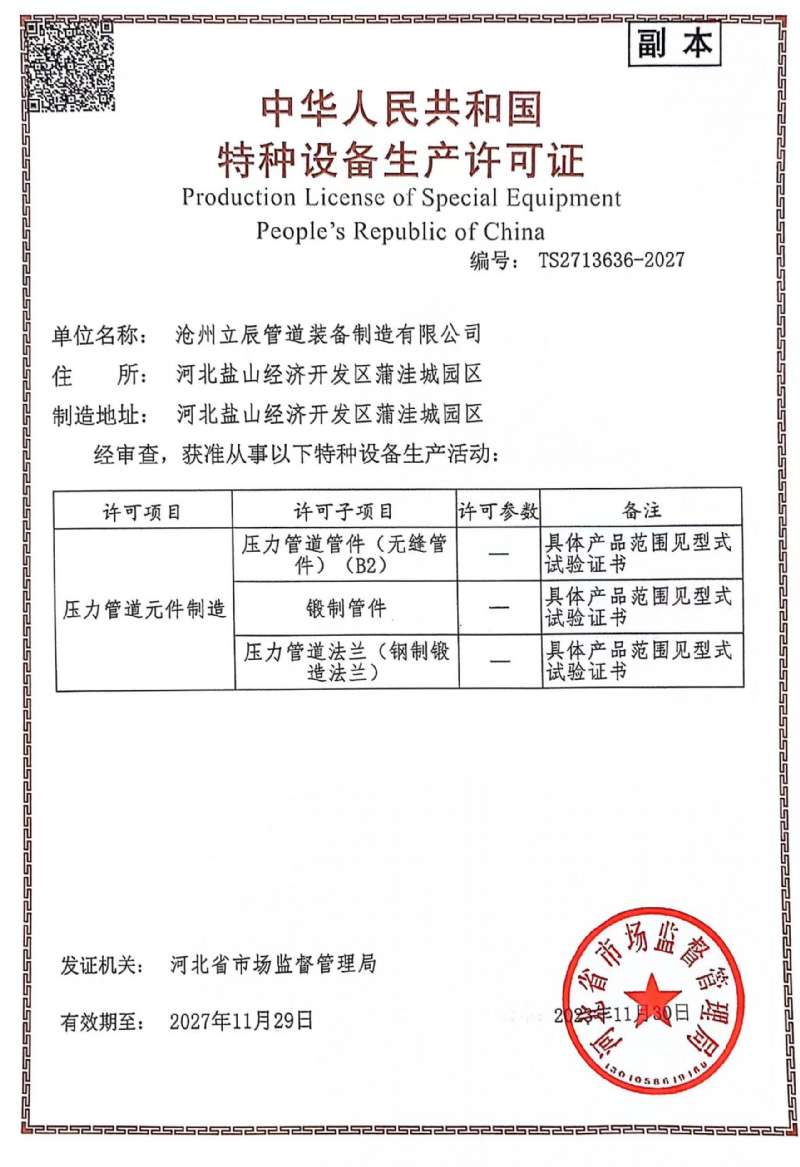 公司產(chǎn)品均通過ISO9001:2000質(zhì)量體系認(rèn)證彎頭、法蘭、彎管等產(chǎn)品,2001年被河北省技術(shù)監(jiān)督局批準(zhǔn)采用高國際標(biāo)準(zhǔn)認(rèn)可證書;生產(chǎn)的不銹鋼彎頭獲省級優(yōu)質(zhì)產(chǎn)品稱號;Ф630-Ф720無縫推制彎頭為省內(nèi)首創(chuàng)。